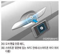 1) 스마트폰을 차량 도어 손잡이에 터치하여 도어 잠금/잠금 해제 가능