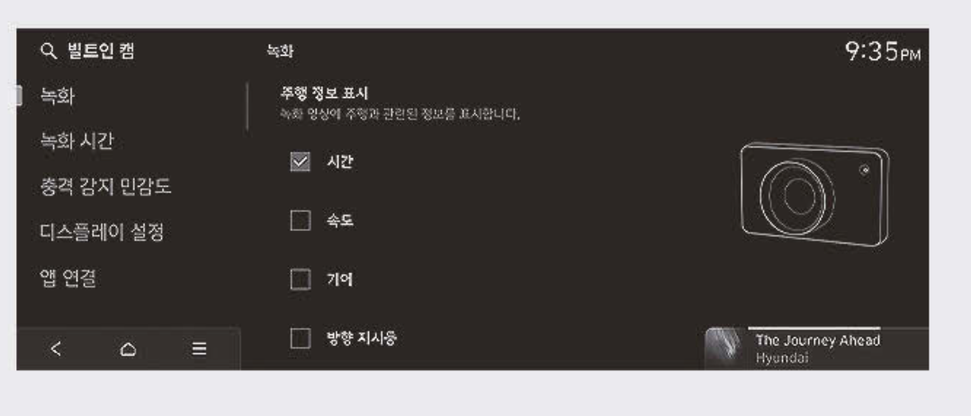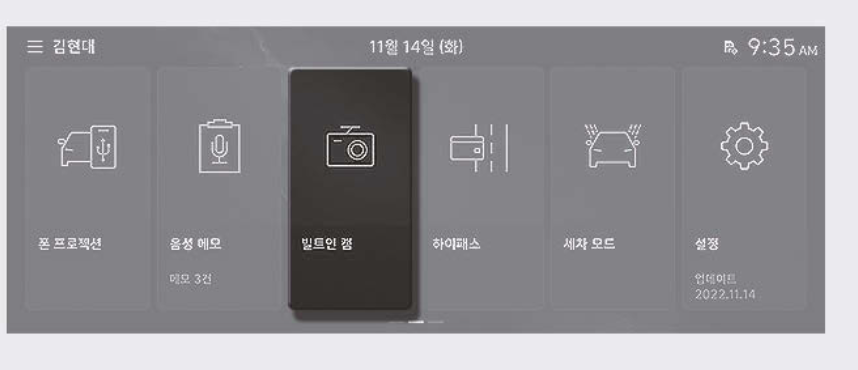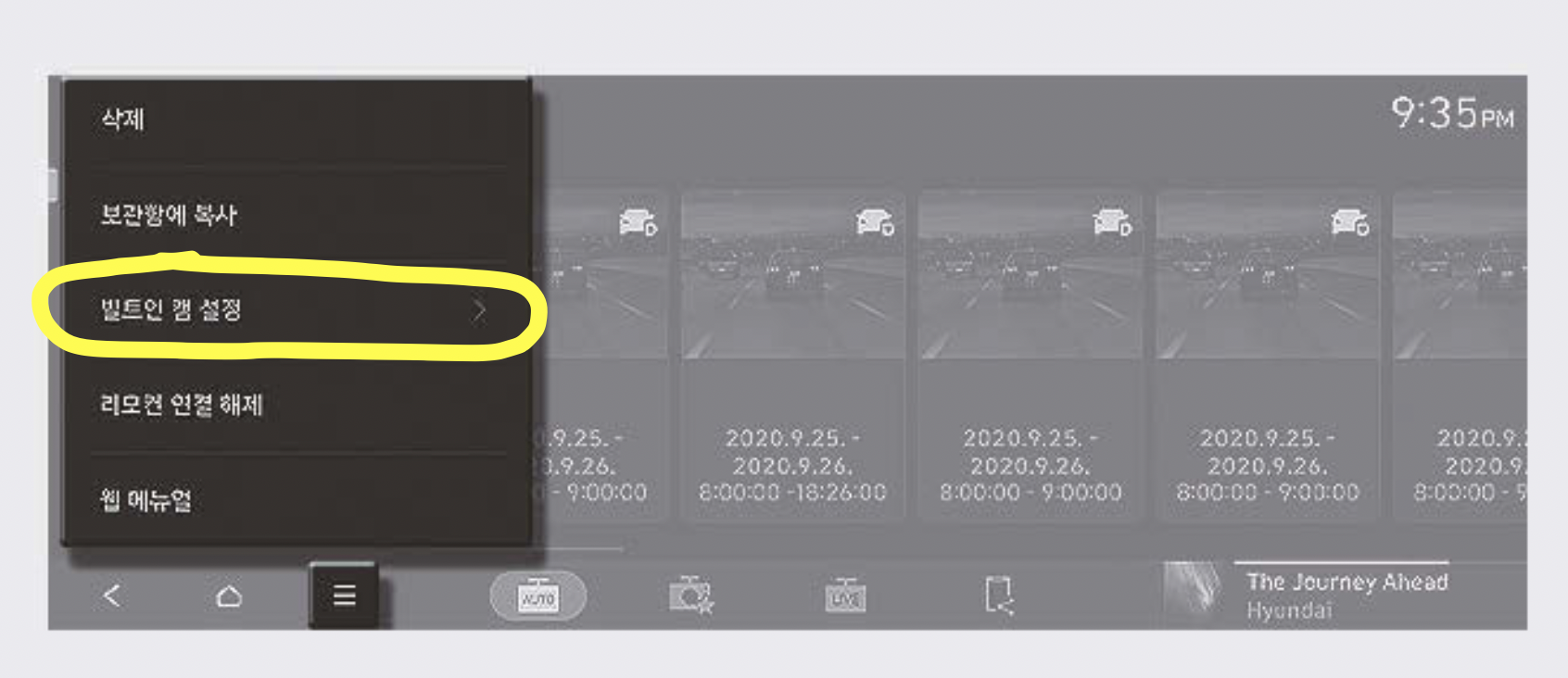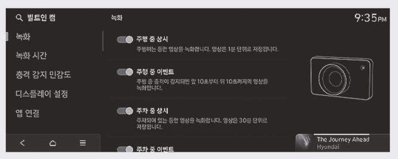 - 내비게이션 홈 화면에서 빌트인 캠 선택. 이후 "빌트인 캠 설정"을 선택한다