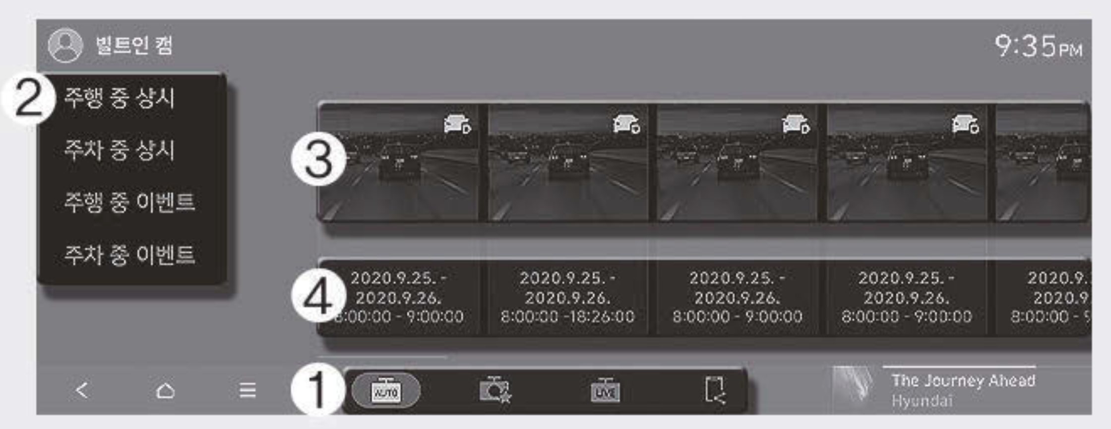 - 앞/뒤 차량이 이상하다거나, 영상을 따로 저장해둬야 할 순간들이 있다. 잘못하면 주행중에 해당 영상이 지워질 수 있기 때문이다. 이럴 땐, 짧게 빌트인 캠 버튼을 누르면 이벤트 영상이 녹화된다