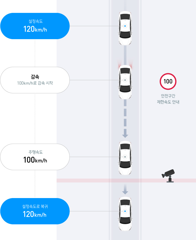 안전구간(NSCC-Z) 기능은 고속도로, 자동차 전용 도로에서 안전 속도 구간에 진입 전 자동차가 스스로 속도를 줄였다가 기존에 설정한 속도로 복귀한다. 내차의 SCC 세팅을 120km/h로 하고 가고 있을때 100km/h 안전 속도 구간이 있다면, 속도를 100km/h에 맞게 줄였다가 구간 통과 후 다시 120km/h로 높인다.