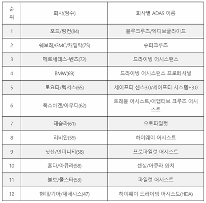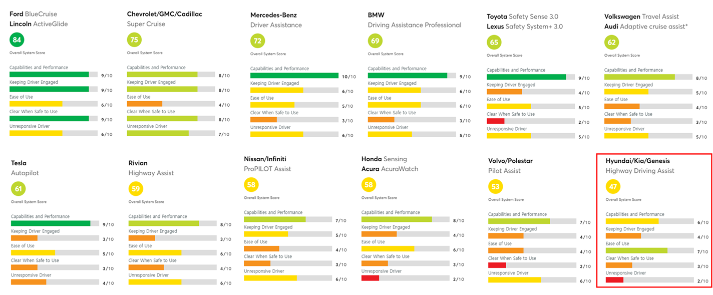 DDMS(Direct Driver Monitoring System)이 적용된 포드와, GM이 높은 점수를 받았다. 아무래도 일반적인 토크 인식을 통한 핸즈오프 경고 방식은 다양한 방법으로 치팅을 하는 경우도 있다. (물통 끼우기, 무게추 달기 등) 그래서 직접 운전자를 모니터링하는게 가장 안전하다고 판단한것 같다. 상위 두 제조사를 제외하면 대부분 점수가 낮다