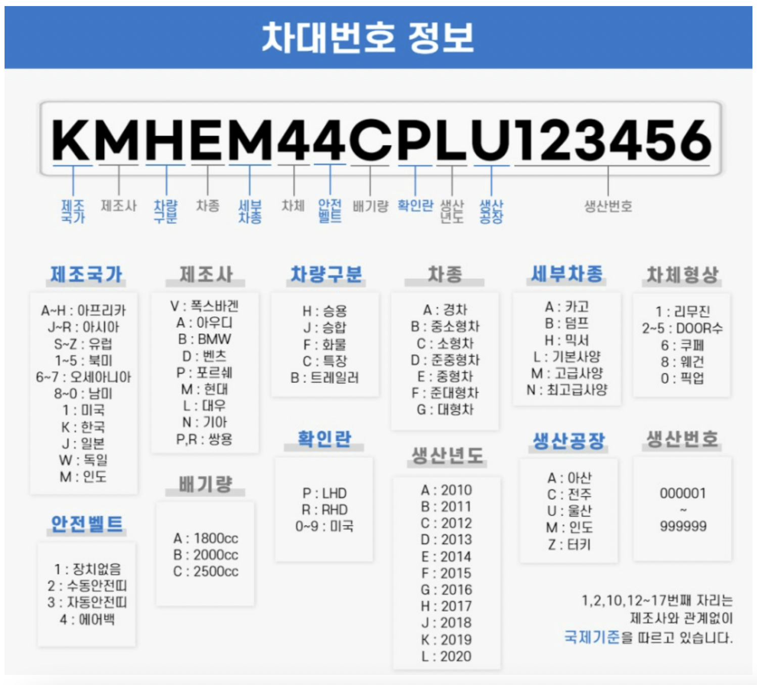 차대번호는 총 17자리의 영문과 숫자로 되어 있다. 3(차량구분) ~ 9(환인란) 까지는 제조사 자체적으로 설정된 부호를 사용한다. 그러나 이를 제외한 나머지 숫자는 어느회사건 동일하기 때문에, 제조사와 제작연도를 쉽게알 수 있다.