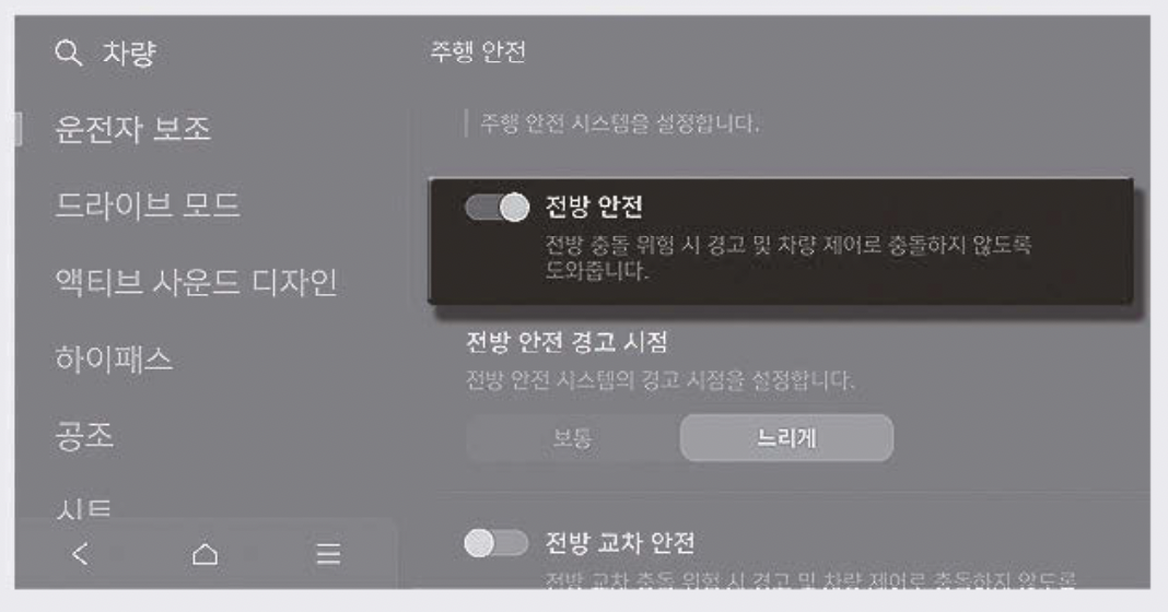 주행 안전에 들어오면 "전방 안전" 이라는 표시가 있다. 여기서 on/off를 할 수 있다. 만약 너무 빈번하게 울려서 끄려는 사람이라면, 경고시점을 느리게로 변경하는걸 추천한다. 어쨋든 기능이 작동해서 사고를 막아주는게 더 중요하기 때문이다