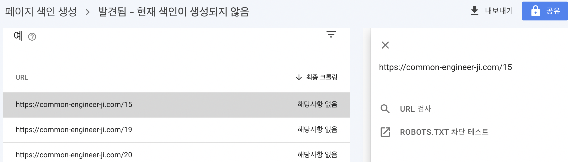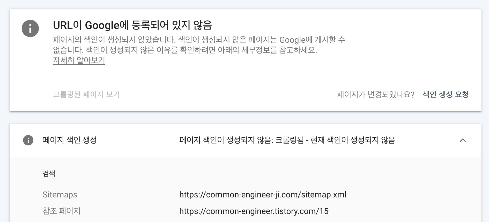 아무래도, 홈페이지 주소를 변경해서 그런것 같다. 원래 common-engineer.tistory.com 이었는데, common-engineer-ji.com으로 내 도메인으로 변경했다. 이 과정에서 내 게시글이 구글검색 패턴에서 뭔가 오류가 생긴것 같다. 덕분에 최근에 작성한 거의 모든 글이 문제를 일으켰다