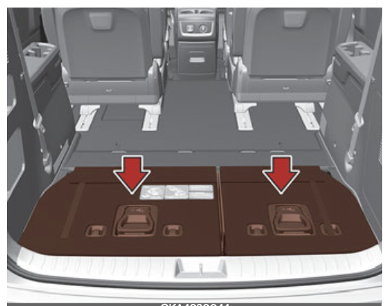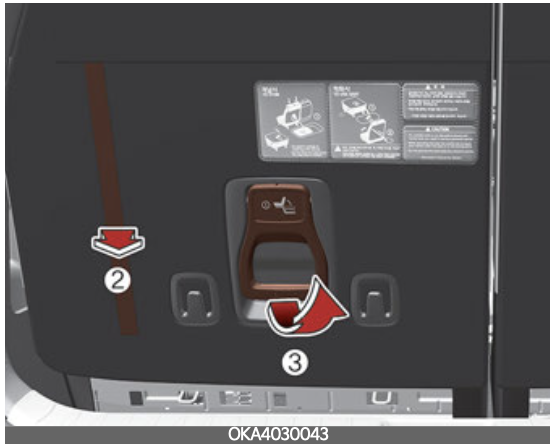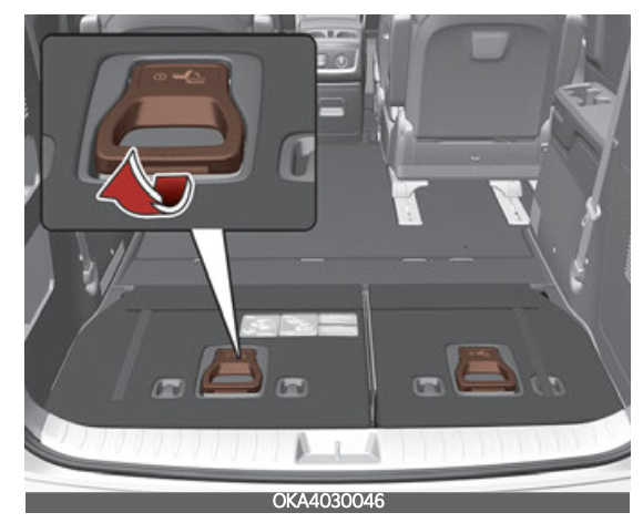 4. 시트 격납 레버를 들어올리면 시트 등받이가 접히면서 시트 하단의 고정이 해제됩니다. 이때 레버를 잡은 상태로 시트를 뒤쪽으로 당기면 시트가 격납됩니다.