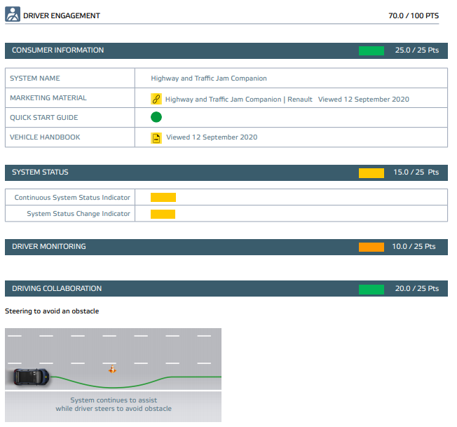 - Driver Engagement 36점, Vehicle Assistance 91점, Safety Backup 95점