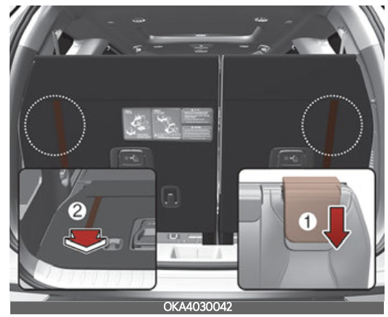 3열 시트 접는 방법 1. 안전벨트가 손상되지 않도록 안전벨트 및 안전벨트 버클을 보관 장소 및 고정 홀더에 넣으십시오. 2. 헤드레스트(1)를 최대한 아래로 내리십시오 . 필요시 시트 등받이를 수직 상태로 조절하십시오(2) 3. 시트 등받이의 시트 격납 레버를 들어올리십시오. 4. 시트 격납 레버를 들어올리면 시트 등받이가 접히면서 시트 하단의 고정이 해제됩니다. 이때 레버를 잡은 상태로 시트를 뒤쪽으로 당기면 시트가 격납됩니다. 5. 시트 격납이 완료되면 시트 등받이 상단을 눌러 격납이 확실히 고정되었는지 확인하십시오. 시트 등받이가 접힌 상태에서 시트를 격납하지 마십시오. 이 경우 시트가 손상될 수 있습니다. 3열 시트 펴는 방법 1. 시트 격납 레버를 들어올리면 시트 격납의 고정 상태가 해제됩니다..
